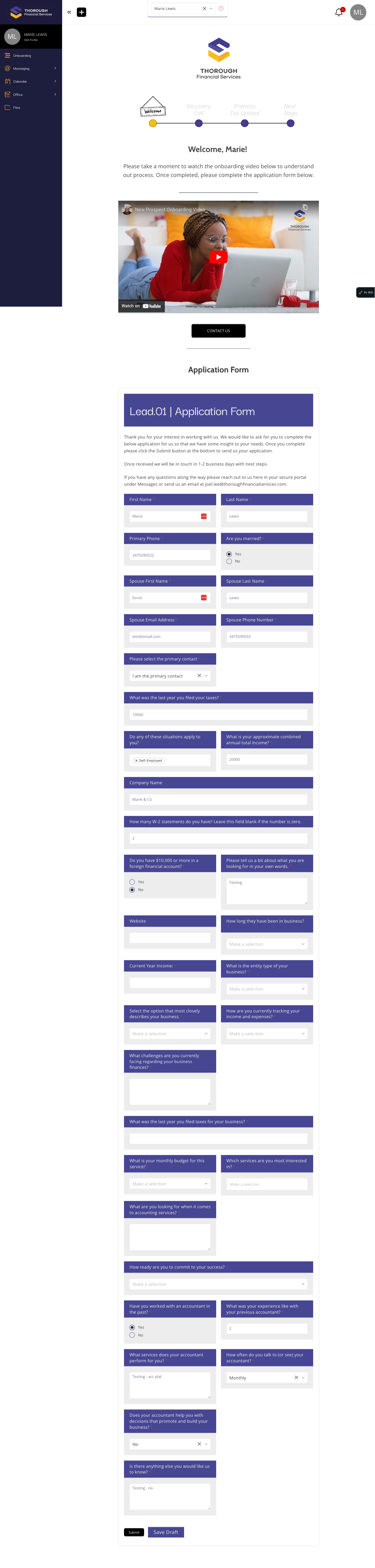 - The client completes the application form, including conditional logic fields (e.g., marital status, spouse information).